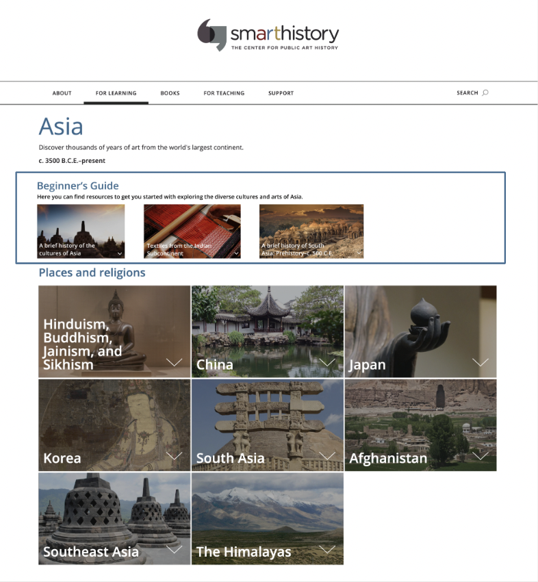 We recommend to order the landing page content in the same order as the sidebar navigation to maintain consistency across the site and provide users with a constant idea of where there are within Smarthistory.