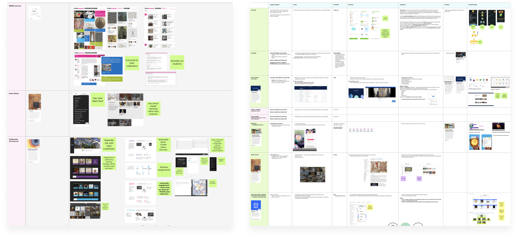 I completed a competitor analysis of 10 organizations with metrics of focus, incentives, learning methods and their largest audience. From organizations like MOMA, National Museum of Korea, and the Smithsonian Learning Lab, we were able to learn what digital solutions were working for other organizations.