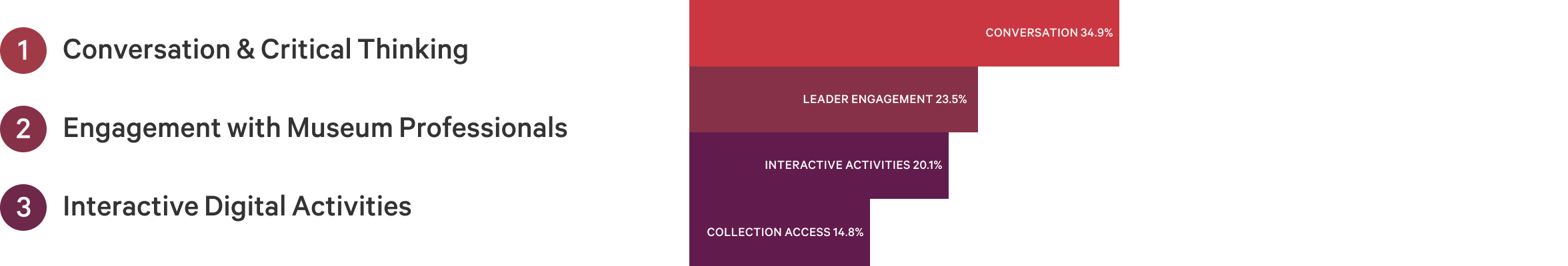 When program participants were asked ‘What are your most favorite methods to learn about the Museum?’ The top 3 answers were : Conversation and critical thinking, engagement with museum professionals, and interactive digital activities.